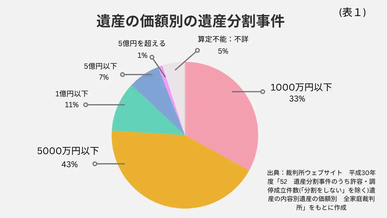 昨今では、遺産分割事件も増加傾向にあり、とくに兄弟姉妹間での相続トラブルが多いようです。また相続財産が自宅だけのような総資産が5000万円以下の家庭で相続トラブルが多いことが明らかになっています(表1)。